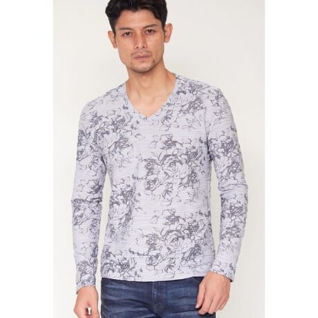 ウェーブジャカードにフラワープリントを施したVネックカットソー。