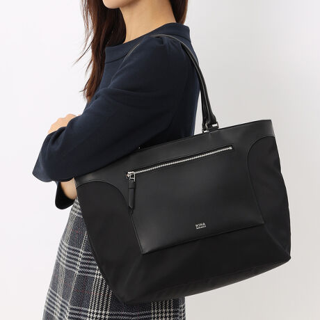 A4ファイルもスッと入るわりに大きく見えなくて、ファスナーがついていて、部分的な本革使いだから軽いのにきちんと見えて、狭い肩からずり落ちることもなく、理想的でした。外ポケットも便利です。