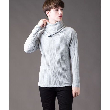 手触りの良いニット素材で防寒性、着用感の良いドレープネックニットソー。