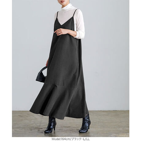 ひらっと揺れるシルエットが大人かわいいキャミソールワンピース。フェミニンな印象のマーメイドフレアラインですが、すっきり見えするVネック開きが程よくシャープなニュアンス感を与えてくれます◎。