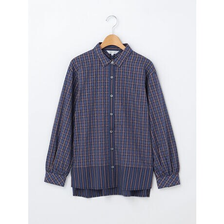 エレメントオブシンプルライフオリジナルのチェック柄×ストライプ柄でトレンド感のある前開きタイプのブラウス。異なる柄のMIXのデザインに遊びがあり、新しさを感じるアイテム。綿100%で、肌触りと着心地の良さが特徴です。インナーに、配色と合わせたカラーをコーディネートするとこなれ感が出てオススメです。