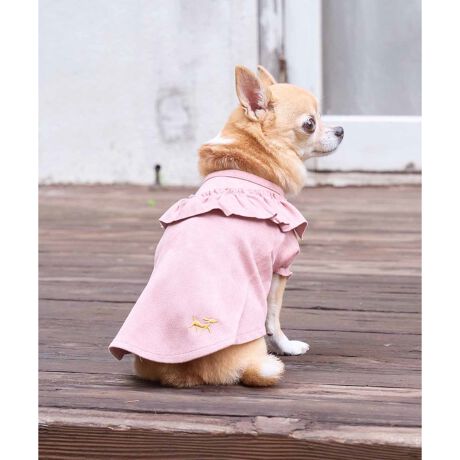 ・しなやかなフェイクスウェードを用いた、フリルネックのドッグ用ワンピース。