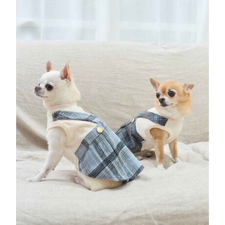・チェック柄のジャンパースカートを重ねたような、フェイクレイヤードデザインのドッグウェア。