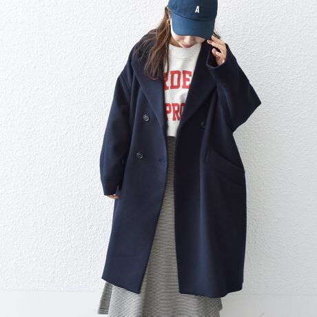 シンプルながら、少し大きめの衿やリラックスなサイズ感のピーコート。