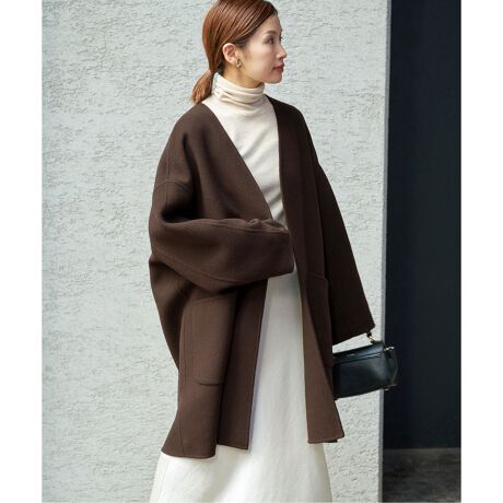 量感たっぷりの大き目シルエットで、前を留めるボタンやフックなどは無く、サッと羽織るタイプでこなれ感のあるコート。