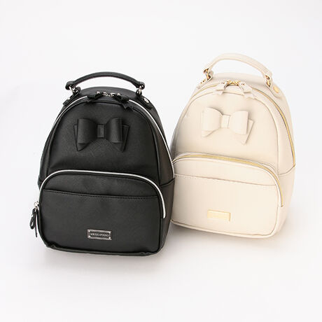 立体的なリボンが可愛らしいミニリュックです。上品な光沢感の合皮に大人っぽいロゴプレートで高級感をアップ。メイン収納とは別にフロントポケットや内側にもファスナーポケットを備え、荷物を整理しやすい設計です。≪重さ≫F/約450g