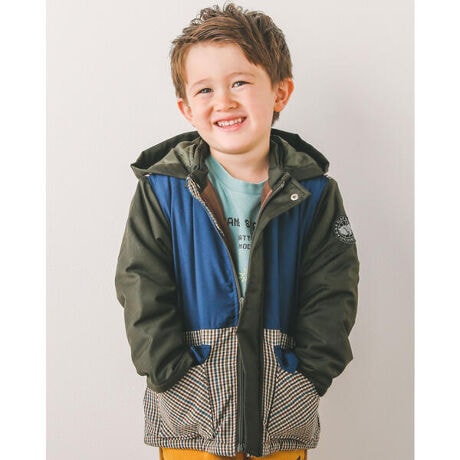 取り外し可能 フード 付き チェック 切り替え 裏フリース 中綿 ジャケット (90〜130cm)