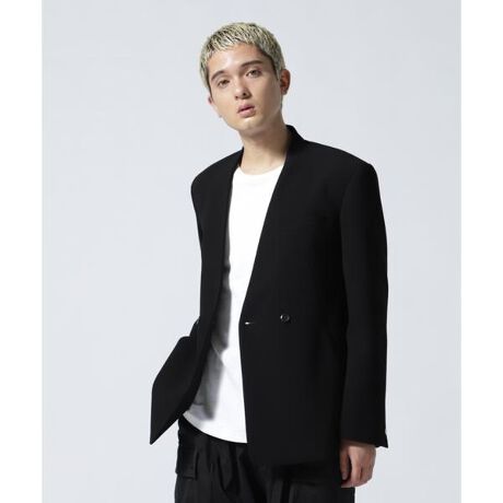 ネックラインがすっきりとしたノーカラータイプのジャケットで、レギュラーフィットのためインナーにはカットソー類をはじめ、ノーカラーシャツや薄手のタートルネックニットなどが好相性。