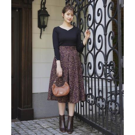 【仕立て映えするゴブランジャガード織が、コーディネートを格上げするタックフレアスカート】【Point】・ヴィンテージ調のゴブランジャガード織がAutumn moodを深めるタックフレアスカート。・計算されたタックがお腹周りをカバーしながら、女性らしい美しいシルエットの裾の広がりを楽しめます。・ショートブーツにも合う長すぎない着丈が、カジュアルダウンしながらデイリーに着やすい一枚。・日本製の生地と日本の縫製にこだわって丁寧に作られた、本物志向の美しい仕上がりが自慢のアイテムです。【Design/Styling】高見えするゴブランジャガードが、コーディネートをワンランク格上げするタックフレアスカート。一枚で着映えするジャガード織で表現する花柄が、気品ある着こなしに仕立ててくれる一枚です。ボウタイブラウスと合わせたフェミニンなスタイルから、すっきりとしたリブニットと合わせた洗礼されたクラシカルなスタイルまで着こなしで印象を変えられるスカートです。【Fabric】ハリ感のある生地が立体的なフレアシルエットを作り出すタックフレアスカート。高見えするゴブランジャガード織で表現するヴィンテージライクな花柄が、気品ある着こなしに仕立ててくれます。ウエストのバック部分は、ゴムを入れているので長時間の着用でも疲れにくく、安心して着ていただけます。ケア方法:ドライクリーニングをお勧めします。透け感:なし裏地:あり伸縮性:なし(ウエスト部分:後ろゴムあり)光沢感:なし生地の厚さ:中肉