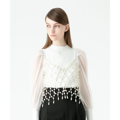 パールと竹ビーズを使ったビスチェ。シンプルなトップス、ワンピースに重ねるだけで華やかさをプラスします。