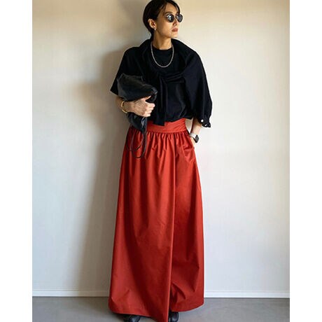 坪田あさみさんコラボパンツ。ハイウエストで、大胆な太さで,一見スカート見えするラップ仕立てのボリュームパンツ。ウエスト後ろ部分は、ギャザーゴムのプルオン仕様で、楽に、簡単にはけます。張り感のあるタフタ素材でニットやウールのものと合わせても全身が重くならないようにコーディネートに軽やかに取り入れたい。