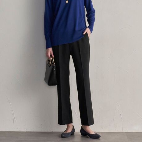 セミフレアのラインで、膝の位置が高く、美脚に見えるパンツです。