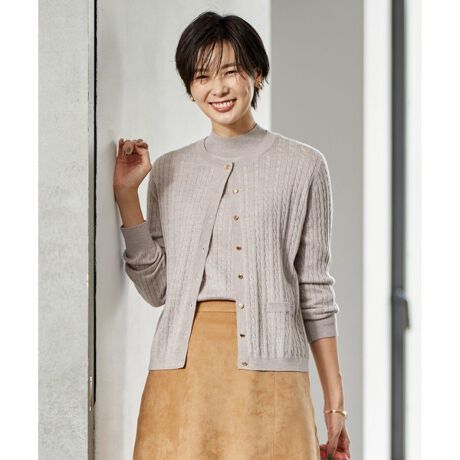 いつの時代も愛されるトラッドスタイルをアレンジした、ミニケーブル柄のクルーカーディガン。ブランドロゴの入ったゴールド釦が華やぎ、コーディネートのアクセントに。羽織りとしてはもちろん、ボタンを閉めればトップスとしてもお使いいただける汎用性の高いアイテムです。同素材のハイネックニットとツイン風に合わせるのもおすすめ。