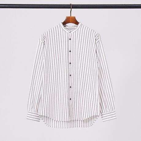 ストライプ柄のバンドカラーシャツ。ややオーバーサイズに作られているので、リラックススタイルにもおすすめです。