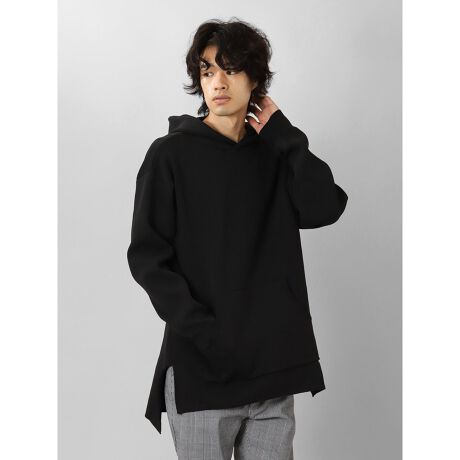 シンプルなデザインで合わせやすい、長袖のプルオーバーパーカーです。総針×リブ編みで切り替えたデザインが、さりげないアクセントになっています。カンガルーポケット付きで機能性にも優れています。前後差を付けたスリットデザインで、ラフな雰囲気を表現しています。