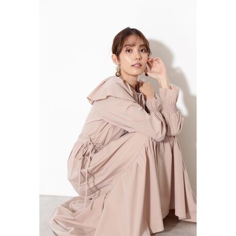 表情をかえられるビッグカラー付ワンピースポリエステルのタフタ素材を使用、長いシーズン着用できます。ビッグカラーはケープのように着脱ができる2Way仕様。袖口のシャーリングで手首でとまるロングスリーブがフェミニンな印象。ウエストは紐で絞れるため、フィット&フレアシルエットにも、紐をゆるめてリラックスしたシルエットに、上からフリンジベストを着るなど、様々な着こなしを楽しめます。