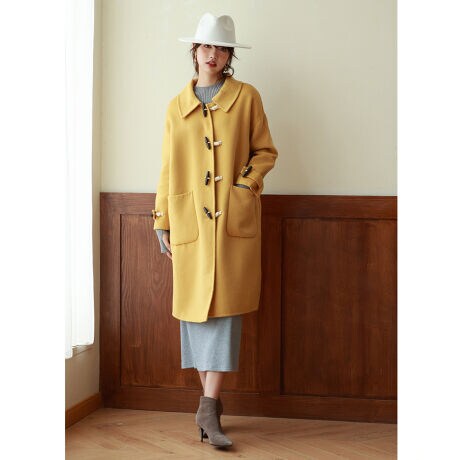 大きめステンカラーとダッフル風のホーンボタンがガーリーなウール混ダブルフェイスのロングコート。