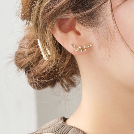 【リーフモチーフにセッティングされたキュービックジルコニアとパールが華やかなピアス】