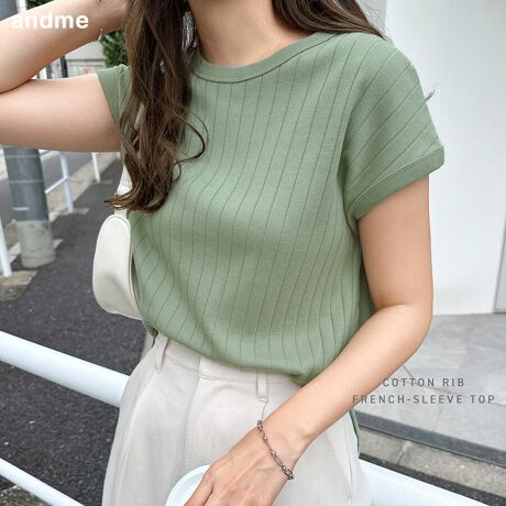 コットンフライスフレンチスリーブリブトップス