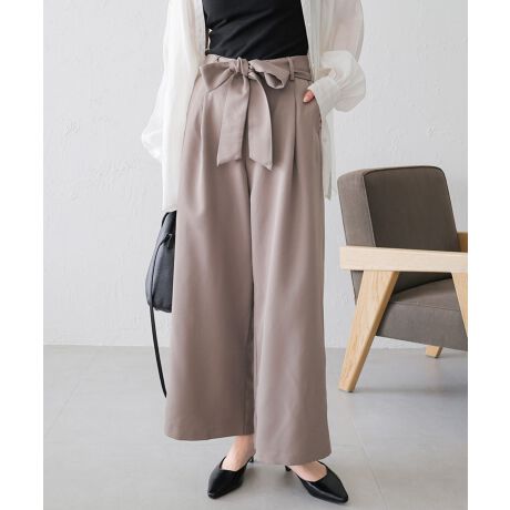 きれいめ ツイル 美脚 ウエストリボン タック ワイドパンツ