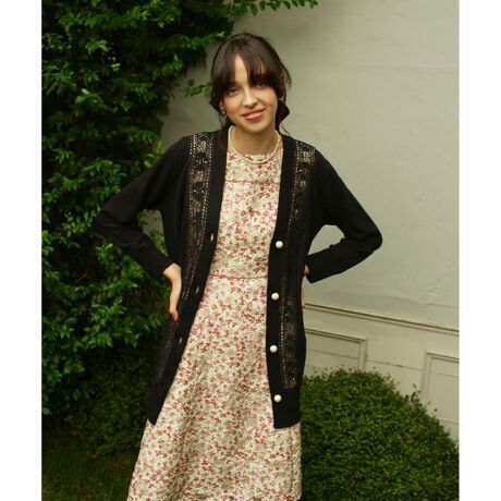 透け感のあるレースが繊細でトレンドを感じさせるリラクシーなニットカーディガンです。パールボタンやレース使いがエレガントでドレスにふわりと羽織って優しい雰囲気を演出します。