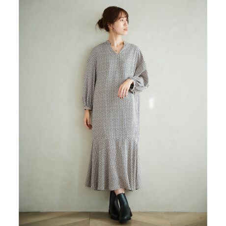 シーズンムードのクラシックな装いが叶う幾何柄デザインのワンピースです。