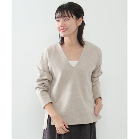 深めのVネックが首回りをすっきり見せてくれ、きれい目に着られるトップスです。