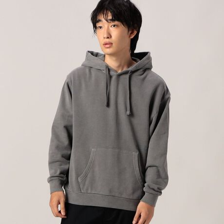 縫いあがった商品にピグメントダイ加工を施し、エイジング感のある表情に仕上げたロゴパーカーです。