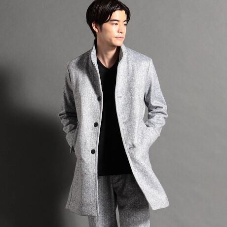 フリース素材を使用した、イタリアンカラーの様に前を開けた状態で着れるスタンドコート。表地のストレッチ性を損なわないよう、裏地は全面ストレッチ裏地を採用しています。シンプルで無駄のないデザインに仕上げていますのでどんなアイテムとも合わせやすい商品となっております。93カラーにはノーカラータイプのコートを展開していますのでお好みのデザインをお選び頂けます。表地にはポリエステルの裏毛フリース素材を使用。表面に冬らしいヘリンボン柄とチェック柄の転写プリントを施しました。ウールよりも軽く、カットソー素材ならではの高いストレッチ性がストレスフリーな着心地を提供します。