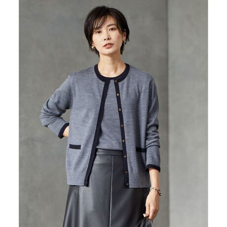 シンプルなメタル釦が上品なクルーネックのアンサンブル。バイカラーで効かせた配色ラインがクラシカルなムードを演出します。ツインセットでも単品でもコーディネートのアクセントになり、きれいめなお出かけスタイルやオフィスシーンに活躍してくれます。