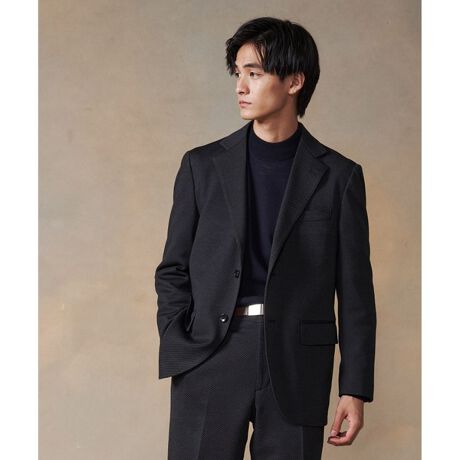 現代のライフスタイルに適した快適な着心地と上質な気分で着用できるジャージーセットアップ■デザインジャージー素材では珍しい「ウィップコード」。欧米では伝統的にハンティングやシューティングをはじめ様々なジャケットに用いられてきたまさしく上質なスポーティ感を感じさせてくれる柄となっています。またジャージーでありながら布帛のような見た目をしているためビジネスでも着用しやすくなっております。ジャージー素材は素材の特性上生地が変形しやすく縫製する上で胸ダーツがあると身頃の反り返り等を起こしやすいためこちらのモデルは寸法は変えないままで胸ダーツを取らない仕様にしています。■素材今回J.PRESS が開発した生地は日本におけるウールの一大産地尾州で開発したオリジナルファブリックです。良質なウールを使用することはJ.PRESS の上質 で 快適な着心地の追求の ために譲れぬこだわりのポイントでした。また一般的に反染めによるジャージー素材が多くなっている中、今回開発した生地は糸染めにより作ることで生地の色のムラを抑え、深みのある上品な色出しにこだわっているところもポイントとなっています。