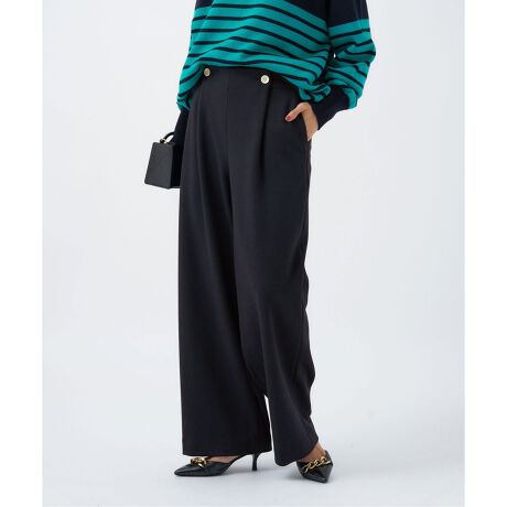 イージーに履けるパンツですが、フロントは深めのタックをボタンで留めたマリン風できちんと見えするデザインです。