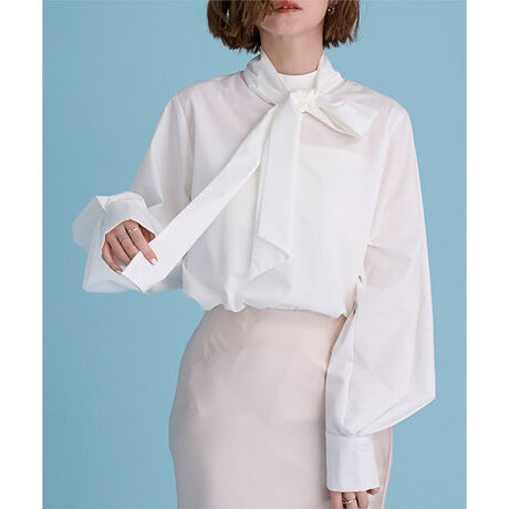 ブラウス自体がハイネックデザインになっており、ボウタイなしでもすっきりと着用いただけます。