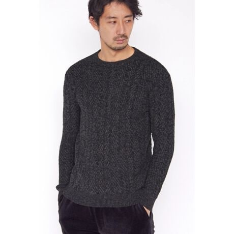 太番手のモール糸を使用したランダムへリンボン柄のメランジクルーネックニットです。