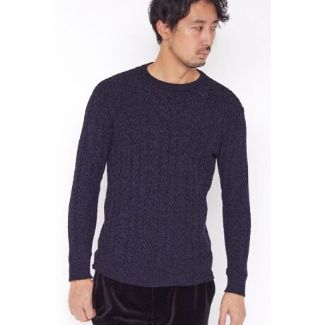 [型番:2001443]【DESIGN】 太番手のモール糸を使用したランダムへリンボン柄のメランジクルーネックニットです。 ジグザグとした立体感のあるへリンボン柄は、ケーブル編みニットと比べシャープでスマートで大人な印象。 コートやブルゾンのインナーとして、一枚でシンプルに決まるアイテムです。 【TEXTILE】 太番手のモール糸とコットン糸をMIXさせたミドルゲージのランダムへリンボン柄編み。 モデル身長 188cm:着用サイズ LL