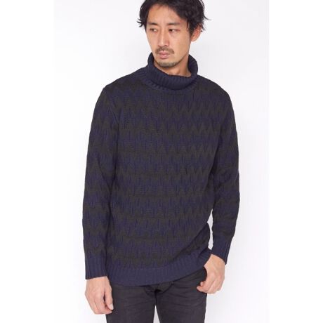[型番:2001444]【DESIGN】 矢羽根柄のジャガードタートルネックニットです。 インパクトのあるジグザグとした矢羽根柄は、冬のスタイリングのアクセントになる1着です。 【TEXTILE】 コットンライクなポリエステル糸を使用した矢羽根柄のジャガード編み。 ポリエステル糸を多本どりし、しっかりとした風合いに仕上げています。 モデル身長 188cm:着用サイズ LL