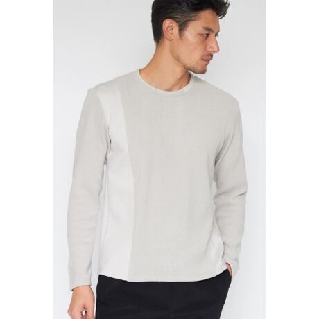 クルーデザインと身頃に切り替えを入れ、トーントーンの切り替えながらも素材感変化で仕上げた一着です。