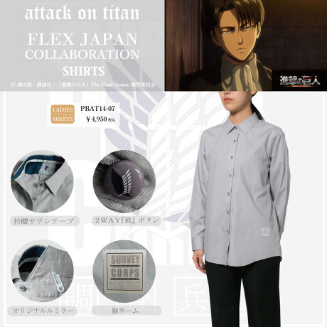 右裾に『SURVEY CORPS 調査兵団』の織ネームを付け、ボトムイン/アウトの着こなしが楽しめます。