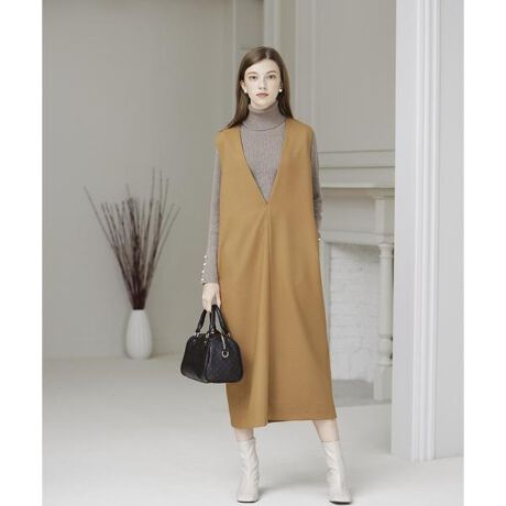 深めのVネックにボクシーなシルエットが大人っぽいジャンパースカート。落ち感がありフラットでクリアな素材を使用しています。カラーはベーシックなベージュ、キャメル、ネイビーの3色で、インナーとの色合わせもしやすくなっています。秋口は長袖カットソーやブラウス、冬にはハイゲージのクルーネックやタートルなどと幅広く合わせやすく、シーズン通して着られます。・水洗い可・裏地なし・ポケットあり■サンプル撮影商品■こちらの商品はサンプルでの撮影となっております。実際の商品とは、サイズや色味、素材、デザイン等の仕様が若干変更になる場合がございます。