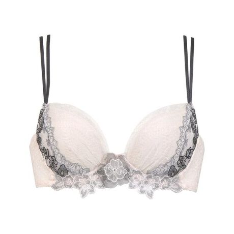 ●胸の谷間を美しく、自分に合わせてととのえる 前中心の低いワイヤーを使い、脇寄せを強くすることで、胸の谷間を美しく見せる●サイズに合わせたバストメイクを (B〜D)カップ、(E)65□75サイズ…ピタッとパッド付き (E〜G)カップ…サポートパネル付きでバストの脇流れを防ぐ (E・F)80・85サイズ、(G)カップ…ボリュームをささえる下カップボーン付き・ラメ糸のきらめく刺繍に立体アップリケを重ねた特別感あるデザイン・バックにまでレースを使用したレーシィなデザイン・胸もと中央のアップリケにはクリスタル付き