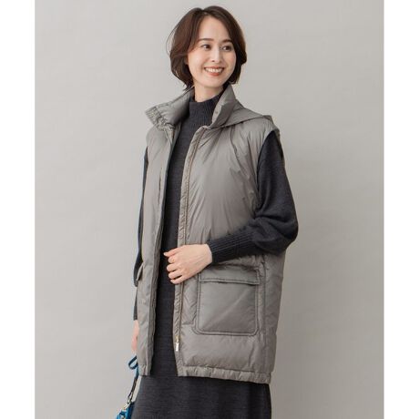 ■デザインステッチレスのディティールがトレンド見えのダウンベスト。ヒップにかかる長めの着丈とボクシーなシルエット、やや肩にかかる肩幅が今年らしいバランス感です。ニットのトップスやワンピースなどにレイヤードすることで、いつものコーディネートを格上げしてくれるアイテムです。フードは取り外し可能で、高めのスタンドカラーのベストとしても着用できます。■素材極細のナイロンを使用した高密度ツイル素材。超細番手のナイロン独特のなめらかさと、上品な光沢感が特徴です。通常ダウンに使用する平組織ではなく、ツイル組織にすることで、よりソフトでしなやかな風合いで、ダウンを入れたときも素材のなじみが良く、美しいシルエットを表現できます。