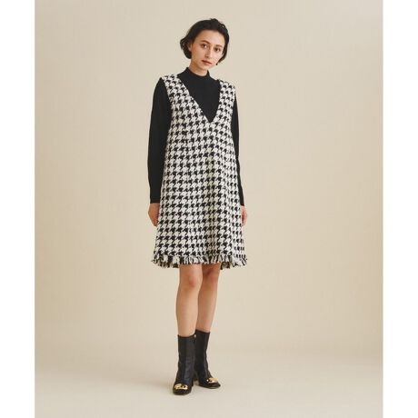 上品に着映える、シーズンスタイルにぴったりなツイードワンピース。イタリアの“CARMIGNANO”(カルミニヤーノ)社の、太い糸とラメ糸をミックスして織ったツイード生地を贅沢に使用しています。ハイネックニットを添えたぬくもりのある装いや、華やかなボウタイブラウスを合わせたクラシカルなコーデまで、様々なトップスとのレイヤードを楽しめる一枚。深めVネックに程よくゆとりのあるシルエットに、裾にはフリンジを施して大人の抜け感を演出しました。今季注目のブーツとの相性も良く、トレンド感溢れるコーディネートをお楽しみいただける一品です。