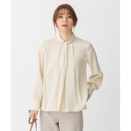 着映える上質素材、シルクストレッチ■デザイン上質なシルクの光沢感と落ち感を生かした、ボウタイのように見える変形ドレープとハイネックがポイントのスマートかつ女性らしい印象ブラウス。ボウタイのようにご自身でバランスを整えることなく着用でき、ブラウスだけでもお顔周りが華やかな印象に。お袖はたっぷりとした長袖のパフスリーブでアウターを脱いだ時もさりげない華やかさを感じられます。■素材肉厚なサテンストレッチ素材を使用。シルクは肌の成分に近い約20種類のアミノ酸を含む【タンパク質繊維】になります。優雅な光沢やしなやかな肌触りに加え、綿よりも豊かな吸放湿性、着心地の良さが特徴です。UVケアの効果もあるので 美容・健康に最適な素材になります。※採寸情報はサンプル商品のデータです。実際の商品と仕様が異なる場合がございます。※画像はサンプルのため実際の商品と仕様が異なる場合がございます。