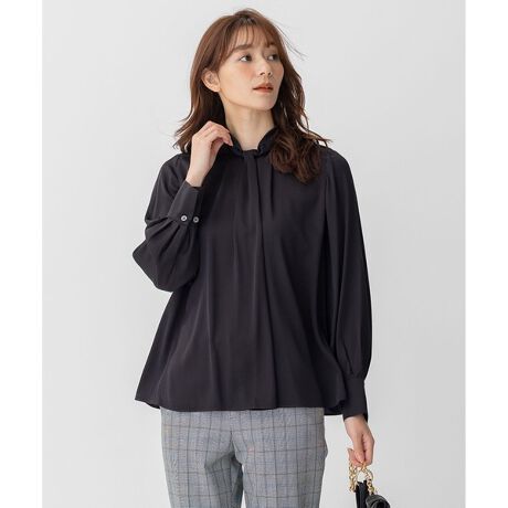 着映える上質素材、シルクストレッチ■デザイン上質なシルクの光沢感と落ち感を生かした、ボウタイのように見える変形ドレープとハイネックがポイントのスマートかつ女性らしい印象ブラウス。ボウタイのようにご自身でバランスを整えることなく着用でき、ブラウスだけでもお顔周りが華やかな印象に。お袖はたっぷりとした長袖のパフスリーブでアウターを脱いだ時もさりげない華やかさを感じられます。■素材肉厚なサテンストレッチ素材を使用。シルクは肌の成分に近い約20種類のアミノ酸を含む【タンパク質繊維】になります。優雅な光沢やしなやかな肌触りに加え、綿よりも豊かな吸放湿性、着心地の良さが特徴です。UVケアの効果もあるので 美容・健康に最適な素材になります。※採寸情報はサンプル商品のデータです。実際の商品と仕様が異なる場合がございます。※画像はサンプルのため実際の商品と仕様が異なる場合がございます。