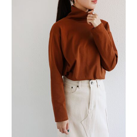 コットン 長袖 ラウンドヘム ハイネック Tシャツ