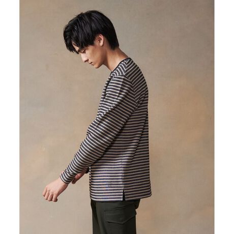 ■デザインクルーネックプルオーバー型です。綺麗な表面感の素材を選んでいますのでジャケットレイヤードスタイルでも楽しんで頂けます。また、内側をソリッドカラーにし、リバーシブル仕様にしていますのでで、気分によって使い分けして頂ける便利で着心地の良いアイテムです。■素材スポンディッシュな膨らみと柔らかさを兼ね備えたダンボール素材のソフトT/Cダブルフェイスです。きれいな表面感でハリもあり発色も良く、軽い着心地が特徴です。