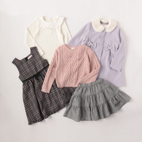 おでかけシーンのコーデが楽しめる5点セットです。フェイクファーの衿付で首元があたたかいコートに、ニットプルオーバーにはリボン×ロゴのアクセントを加えて可愛く仕上げています。丸衿が印象的なTシャツは、やさしい肌触りの生地を使用してデイリーユースにうれしい着心地を実現。一枚でおしゃれ度がアップするジャンパースカートには、オリジナルチェック柄を採用しました。ティアードの千鳥柄スカートは、合わせるトップスを選ばないカラーで仕上げました。それぞれ単品でお手持ちのアイテムともコーディネートしやすいラインナップです。【透け感】透けない【生地の厚さ】普通【伸縮性】なし※Tシャツ・ニットプルオーバーはあり【裏地】あり※Tシャツ・プルオーバーはなし【ポケット】なし※コート・ジャンパースカートはあり【アジャスター】なし※スカートはあり≪コートの重さ≫120cm/約555g