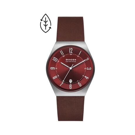 再生ステンレススチールを50%以上使用した37mm径ケースに日付表示付き三針ムーブメントを搭載したGRENENウォッチ。チェリーウッドのサンレイダイヤルにチェリーウッドのレザーストラップを組み合わせました。SkagenはLeather Working Groupのメンバーです。ウォッチストラップは付け替えできません。