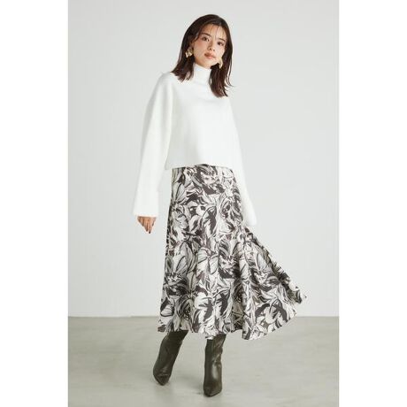 ツイストした切り替えが今時なフレアスカート。ミドルヒップあたりから自然と広がるフレアのシルエットに拘り、腰回りはすっきりとさせつつ裾に向かって大胆にウェーブするパターンが最大のPoint。程よく張りのある中肉の布帛生地はしっかりとした見た目に相反し、柔らかく程よく体に馴染み着心地も良いです。裾をあえて斜めにカットした事で、トレンドのミディ丈をさりげなく取り入れつつ、しっかりと安心感のあるマキシ丈と両方の雰囲気のを兼ね備えたデザインに仕上げました。柄WHTと柄BEGは花柄でも大胆なタッチが甘すぎずに大人っぽく着られる色味に拘り、コーディネートに程よい存在感を与えます。柄NVYはトレンドのストロングカラーを取り入れつつ、レトロな雰囲気を醸し出す柄域がお洒落な雰囲気を演出してくれます。無地のBLKはツイストのディテールを楽しみつつ、モードな雰囲気をぐっと引き上げてくれる、全く違った印象の4色展開で、是非自分に合った色味を見つけて欲しい1着です。