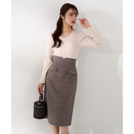 【商品特徴】プロポオリジナルのチェック柄素材で仕立てたタイトスカートです。ウエスト前のハートカットデザインがフェミニンなポイントになり、トップスINがおススメ。トレンドのチェーンパーツを使ったフラップデザインが、クラシカルムードを引き立てます。【スタイリング】シンプルニット合わせはもちろん、ハイネックやリボンタイブラウスをあわせれば、クラシカルな印象の着こなしに。